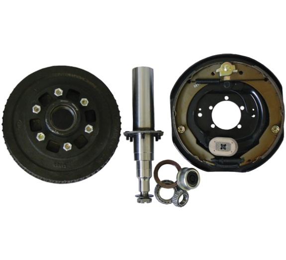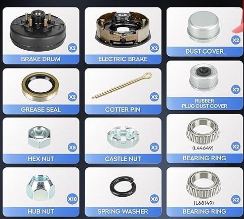 2 Tuercas de castillo para Pivote 2 Arandelas redondas para Pivote 2 Pasadores de chaveta 2 Rodamientos interiores L68149 de 1-3/8" 2 Rodamientos exteriores L44649 de 1-1/16" 2 Sellos de grasa de doble labio de 1.75" 2 Tapas antipolvo 10 Tuercas de rueda 2 Tapones de goma para tapas antipolvo 2 Soportes de resorte para soldar de 2.375" 8 Tuercas de rosca fina de 7/16" para atornillar el freno placas al eje